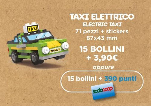 - Taxi Elettrico, con 15 bollini + 3,90 € oppure 15 bollini + 390 punti SocioCoop, composto da 71 pezzi + stickers, dimensioni 87×43 mm;