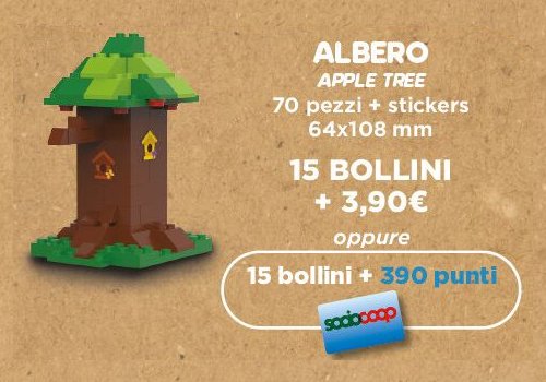 - Albero, con 15 bollini + 3,90 € oppure 15 bollini + 390 punti SocioCoop, composto da 70 pezzi e stickers, dimensioni 64×108 mm;