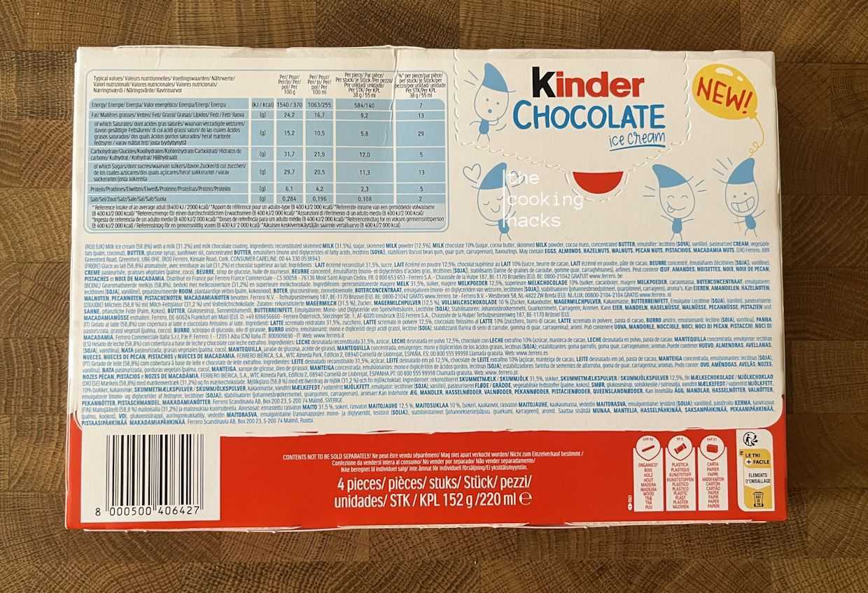 Passando invece agli ingredienti del Kinder Chocolate ice cream abbiamo: LATTE scremato reidratato 31,5%, zucchero, LATTE scremato in polvere 12,5%, cioccolato finissimo al LATTE 10% [zucchero, burro di cacao, LATTE scremato in polvere, pasta di cacao, BURRO anidro, emulsionanti: lecitine (SOIA), vanillina], PANNA pastorizzata, grassi vegetali (palma, cocco), BURRO, sciroppo di glucosio, olio di girasole, BURRO anidro, emulsionanti: mono e digliceridi degli acidi grassi, lecitine (SOIA); stabilizzanti (farina di semi di carrube, gomma di guar, carragenina); aromi.