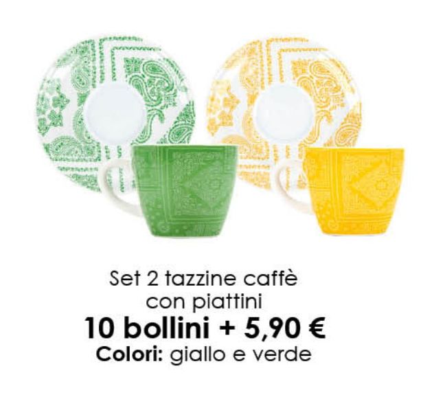 - Set 2 tazzine caffé con piattini di colore giallo e verde, con 10 bollini + 5,90 € di contributo;