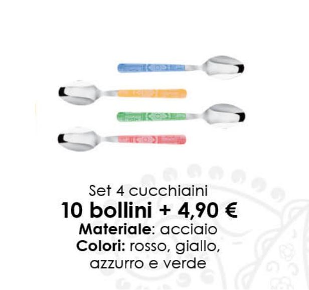 - Set 4 cucchiaini in acciaio di colore rosso, giallo, azzurro e verde, con 10 bollini + 4,90 € di contributo;