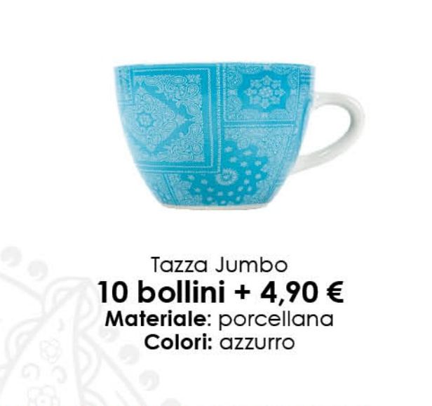 - Tazza Jumbo in porcellana di colore azzurro, con 10 bollini + 4,90 € di contributo;