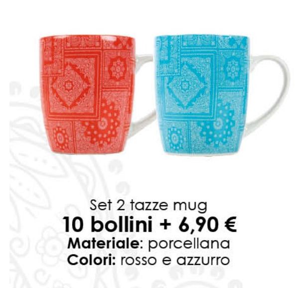 - Set 2 tazze mug in porcellana di colore rosso e azzurro, con 10 bollini + 6,90 € di contributo;