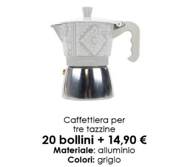 - Caffettiera per tre tazzine in alluminio di colore grigio, con 20 bollini + 14,90 € di contributo;