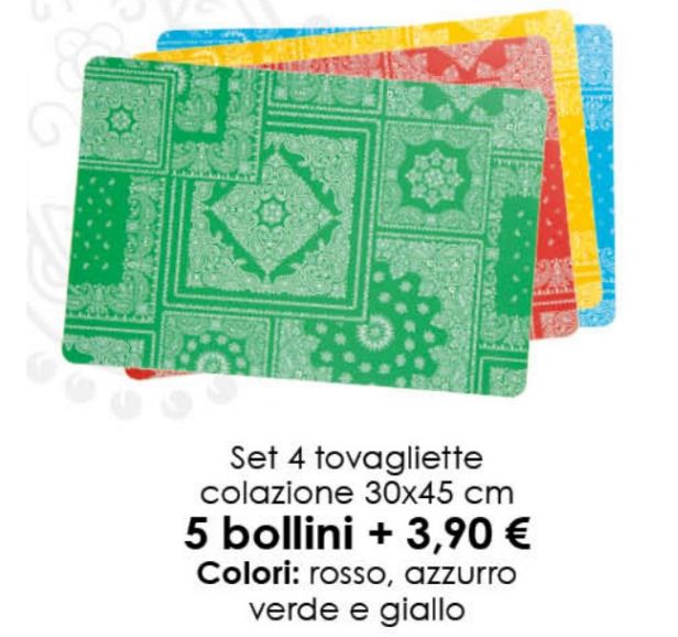 - Set 4 tovagliette colazione (misure 30×45 cm) di colore rosso, giallo, azzurro e verde, con 5 bollini + 3,90 € di contributo.