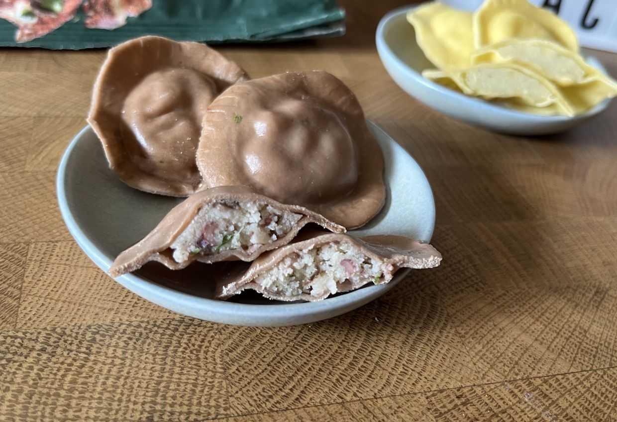 Arrivato il momento della prova, al taglio a crudo il ripieno alla patata si presenta compatto, mentre il ripieno al polpo mostra distintamente i pezzetti di mollusco. Una volta cotti, siamo rimasti soddisfatti dall’assaggio: la morbidezza dei ravioli alla patata andava a sposarsi bene con i pezzettini di polpo che percepivano sotto i denti, riportando alla memoria la morbidezza e il gusto della ricetta estiva del polpo con le patate.