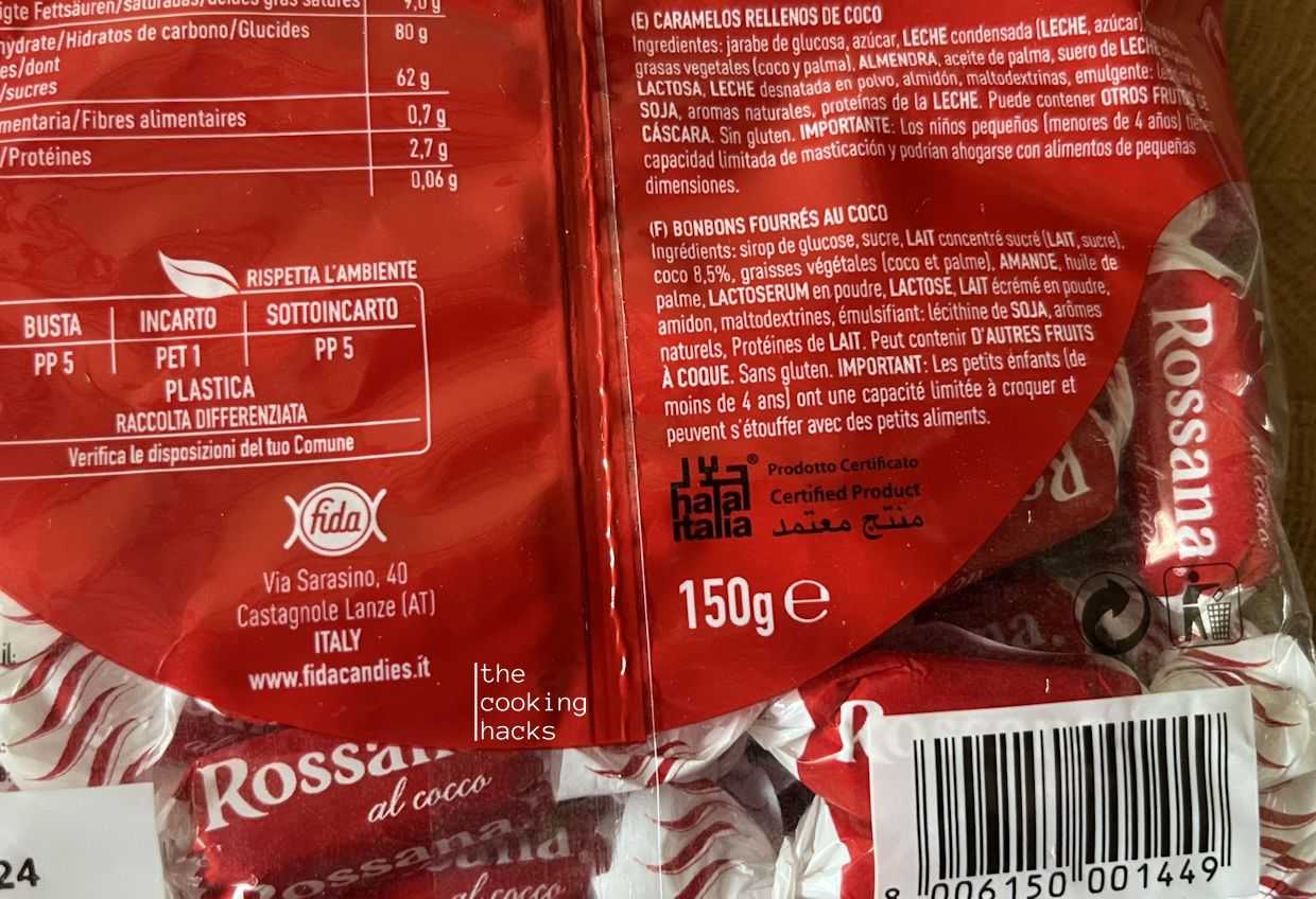 Le caramelle Rossana al cocco sono descritte sulla confezione come “caramelle ripiene al cocco“, inoltre riportano la certificazione Halal e nella descrizione degli ingredienti viene specificato che sono senza glutine. Comunemente nei supermercati trovate la confezione da 150 g, ma esiste anche la confezione da 1 kg come visto nel paragrafo precedente.