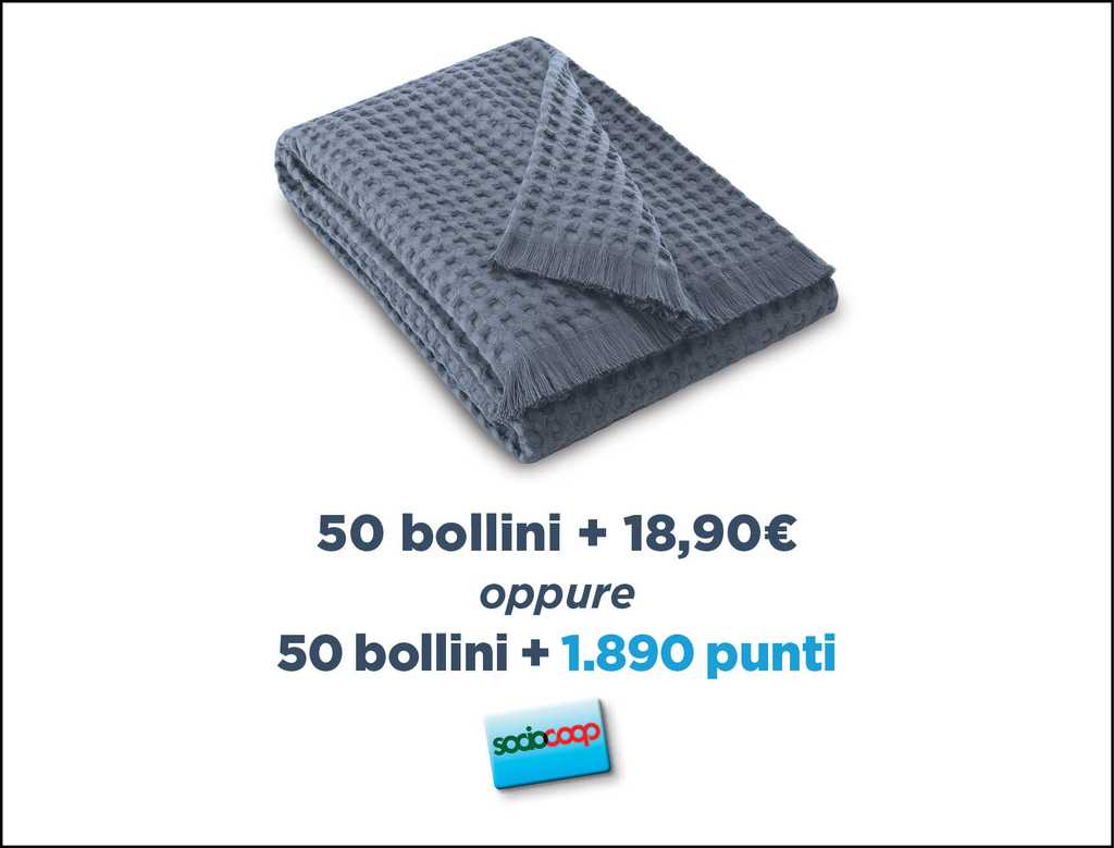 - Plaid con 50 bollini + 18,90 € oppure 1890 punti Socio Coop. Finitura con frange all’orlo in 100% cotone lavorazione a nido d’ape, dimensioni 130×180 cm circa;