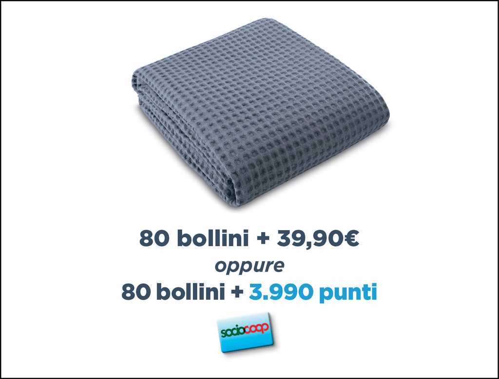 - Copriletto matrimoniale con 80 bollini + 39,90 € oppure 3990 punti Socio Coop. Con angoli stondati in 100% cotone lavorazione a nido d’ape, dimensioni 260×260 cm circa;