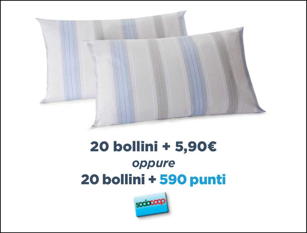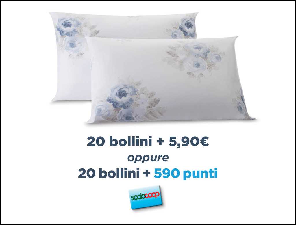 - Set 2 federe fantasia floreale o geometrica con 20 bollini + 5,90 € oppure 590 punti Socio Coop. Federe a sacco in percallo di puro cotone 100%, dimensioni 50×80 cm circa;