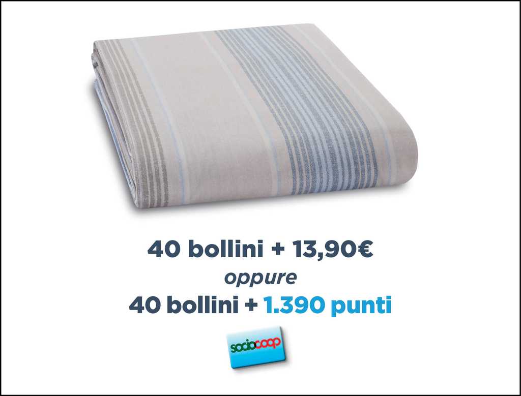 - Lenzuolo con angoli matrimoniale fantasia geometrica con 40 bollini + 13,90 € oppure 1390 punti Socio Coop. In percalle di puro cotone 100%, dimensioni 170×200 cm circa;