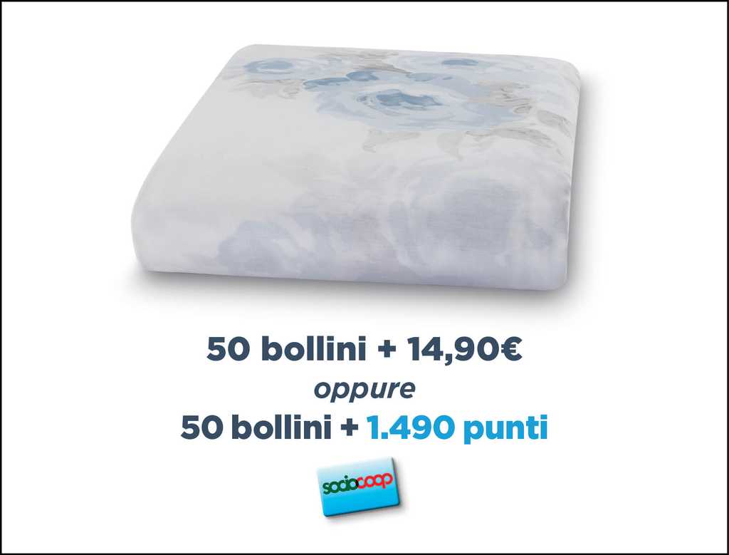 - Lenzuolo piano matrimoniale fantasia floreale o geometrica con 50 bollini + 14,90 € oppure 1490 punti Socio Coop. In percalle di puro cotone 100%, dimensioni 240×280 cm circa;