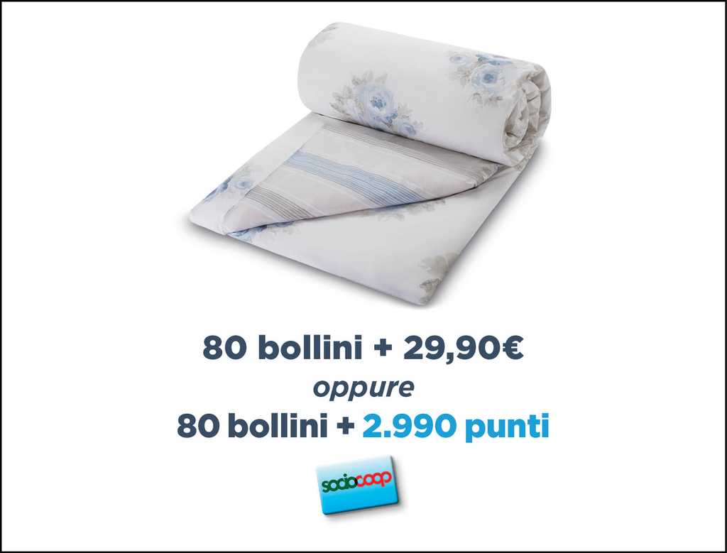 - Sacco copripiumino matrimoniale con 80 bollini + 29,90 € oppure 2990 punti Socio Coop. Double face, coordinabile sia con la fantasia floreale che con quella geometrica, con patella al fondo per rincalzare il materasso. In percalle di puro cotone 100%, dimensioni 255×200 cm circa.